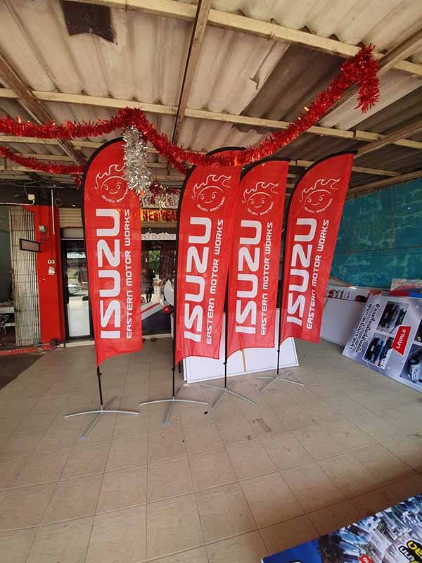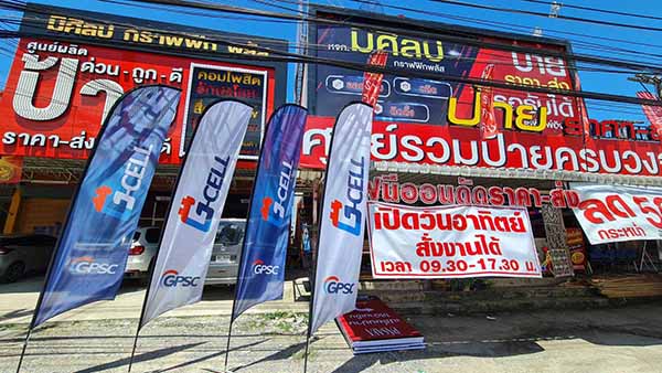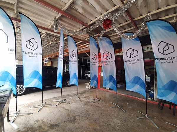 ตัวเสาผลิตจากโครงอลูมิเนียมเกรด A พร้อมตัวท่อที่เป็นวัสดุไฟเบอร์กลาส ทนน้ำทนฝน ไม่มีสนม ติดตั้งง่าย ไม่มีขึ้นต่ำในการสั่งผลิต งานพิมพ์วัสดุผ้า โพลีเอสเตอร์ (Polyester) ตัวเนื้อสีติดทนนาน มีลักษณะเป็นตาข่ายเล็กๆ เพื่อช่วยทิศทางของลมไหลเวียนดีขึ้น ตัวผ้ายังเป็นเนื้องานชิ้นเดียวกันโครงสร้างของธงจึงแข็งแรง